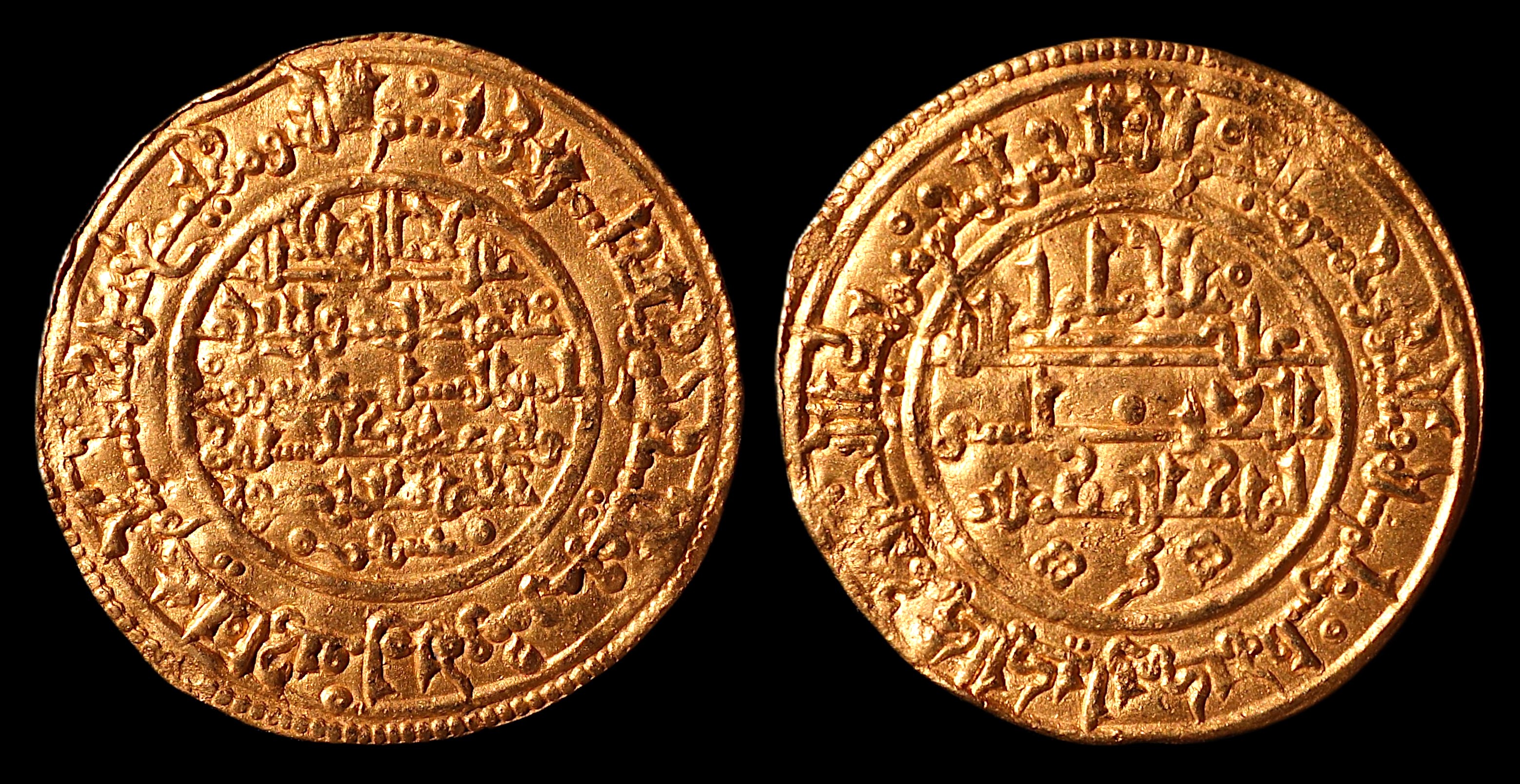 #1.14.6.34 `Ali ibn Yusuf Dinar (4.11g 26mm) citing the heir Tashfin Madinat Fas, 536 A.H. Eust. 232, Liet-JONS 259, Album 466.3 This dinar is a rare variant of the previous one (1.14.6.33) with the title Al-Mansur (the Victorious) for the heir Tashfin. It was minted to celebrate a victory of the heir Tashfin over the Almohads in Fas in AH 536 (see Liet-JONS 259). To click on the picture provides a larger image. Any comment ?: webmaster@coins.alif2.fr |